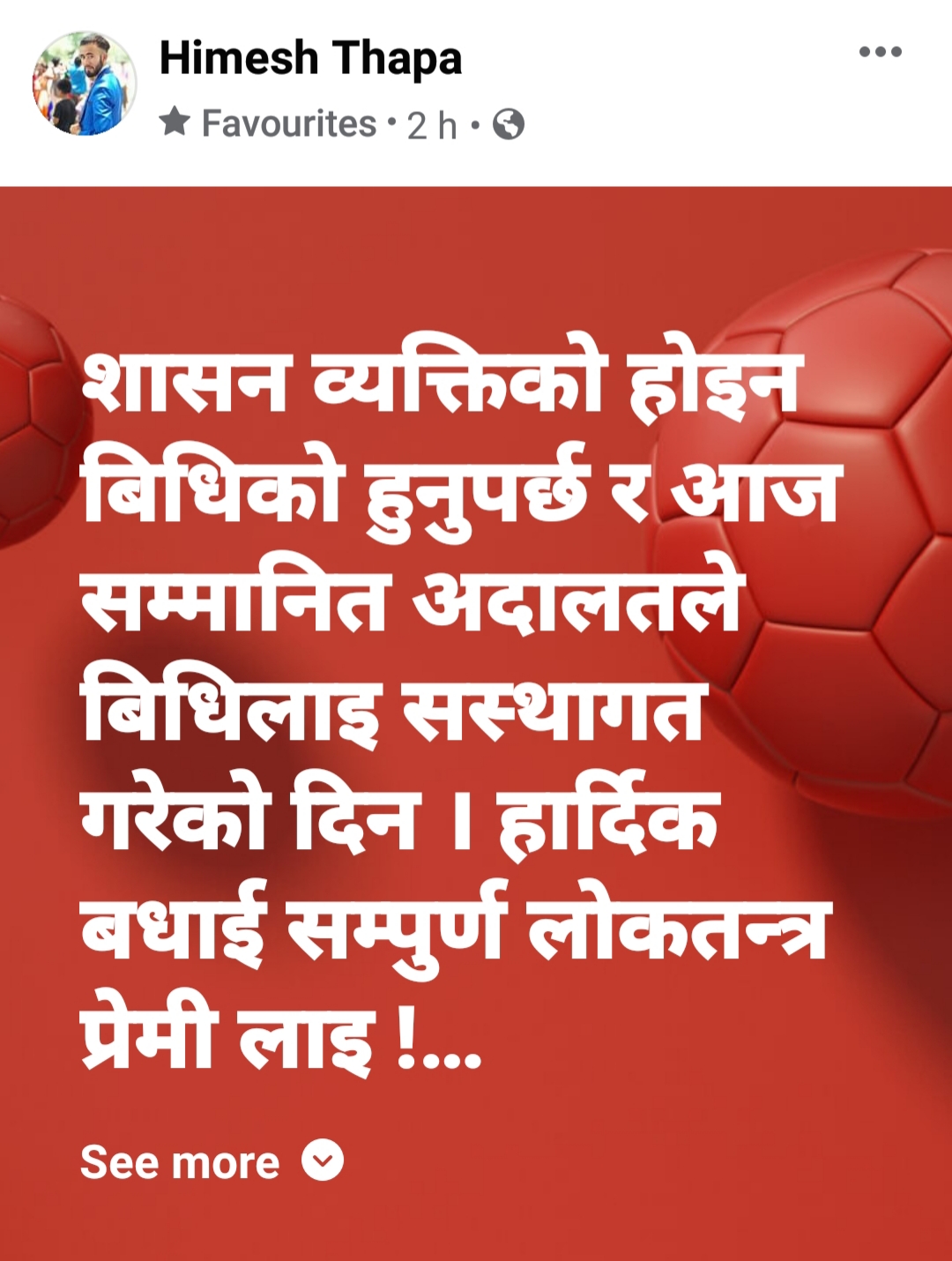 अनेरास्ववियु कंचनपुर जिल्ला कमिटी सदस्य तथा युवा नेता हिमेश थापाले सर्वाेच्च अदालतले प्रतिनिधि सभा पुनर्स्थापना गरेर लोकतान्त्रिक गणतन्त्रको जित भएको बताएका छन् ।
