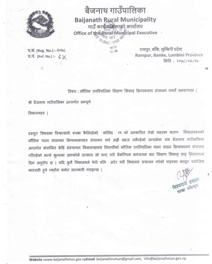 बाँके /बाँकेको बैजनाथ गाउँपालिकाले १७ गते आईतवार एक सुचना जारी गर्दै यस गाउँपालिका भित्र पर्ने केहि संस्थागत तथा समुदायिक विद्यालयहरुले जिल्ला प्रशासन कार्यालय बाँकेको आदेशलाई अटेर गरि विद्यालयहरु संचालन ल्याएको हुदा सो को विद्यालयहरुलाई तत्काल बन्द गर्न “भौतिक उपस्थितिमा शिक्षण सिकाई क्रियाकलाप संचालन नगर्ने” भन्दै सुचना मार्फत जानकारी गराएको छ ।