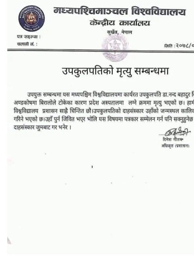 विश्वविद्यालयकै लेटरप्याड प्रयोग गरी निकालिएको विज्ञप्तिमा भनिएको छ, “विश्वविद्यालयमा कार्यरत उपकुलपति प्रा डा सिंहको अण्डकोषमा बिरालोले टोकेका कारण उपचारका लागि प्रदेश अस्पताल सुर्खेत लग्ने क्रममा मृत्यु भएको छ ।