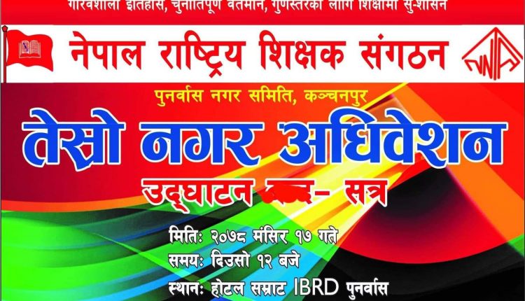 नेपाल राष्ट्रिय शिक्षक संगठन पुनर्वास नगर समितिको तेस्रो नगर अधिवेशन भोलि मङ्सिर १७ गते हुने भएको छ । वामपन्थी शिक्षकहरुको साझा संगठनको रुपमा आफ्नो छुट्टै पहिचान बनाएको यस संगठनले शिक्षकहरुको पेशागत हकहितका लागि काम गरीरहेको छ ।