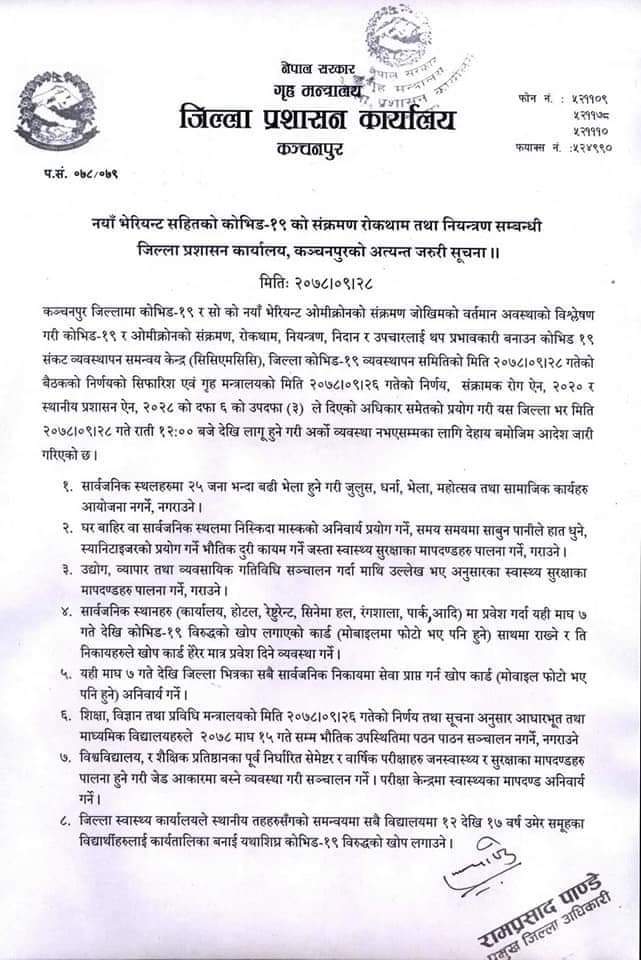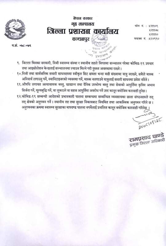 कञ्चनपुर/जिल्ला प्रशासन कार्यालय कञ्चनपुरले स्वास्थ्य मापदण्ड पूर्ण रुपमा पालना गराउने भएको छ । बुधबार जिल्ला कोभिड–१९ व्यवस्थापन समितिको बैठकले कोराना रोकथामका लागि विभिन्न निर्णय गरेको हो ।