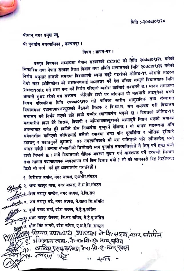 पुनर्वासमा विद्यालय बन्द गर्न माग गर्दै ज्ञापन पत्र पेश,नोक्सानी भए नगरपालिकाले जिम्मेवारी लिनुपर्ने