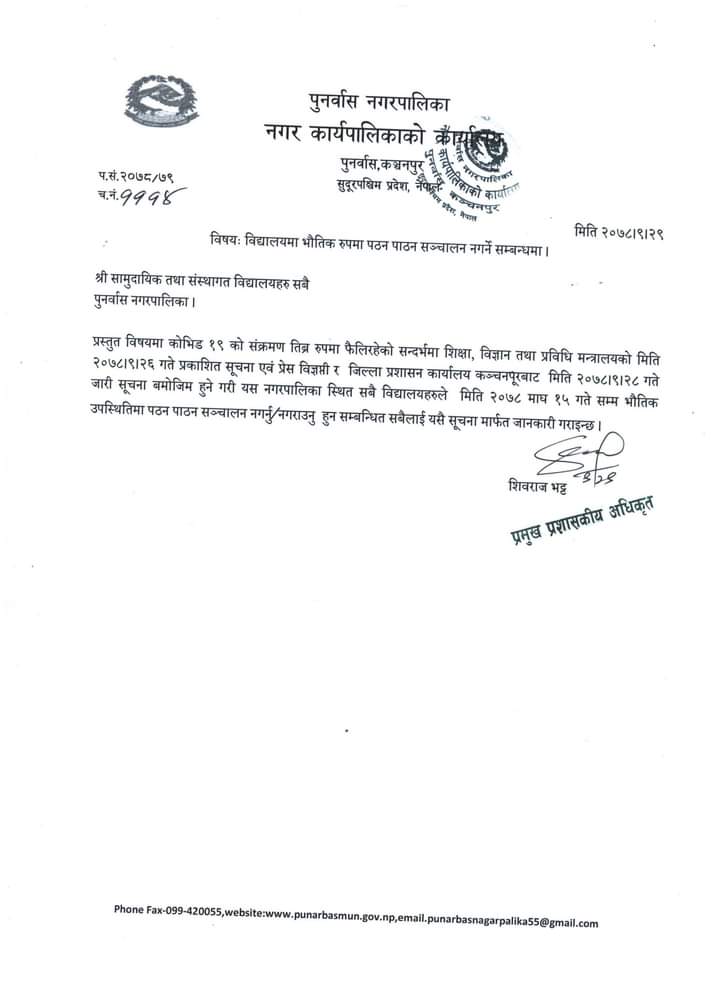 नगरक्षेत्रका सम्पूर्ण विद्यालयहरुमा आगामी माघ १५ गते सम्म भौतिक उपस्थितिमा गरीने पठनपाठन कार्यमा रोक लगाएको हो । प्रमुख प्रशासकीय अधिकृत शिवराज भट्टद्वारा हस्ताक्षरीत सूचनामा कोभिड १९ को संक्रमण बढिरहेको सन्दर्भमा शिक्षा,विज्ञान तथा प्रविधि मन्त्रालयको २०७८।९।२६ गते प्रकाशित सूचना तथा प्रेस विज्ञप्ति साथै जिल्ला प्रशासन कार्यालय कञ्चनपुरको मिति २०७८।९।२८गते जारी भएको सूचना बमोजिम नगरपालिका भित्रका सम्पूर्ण सामुदायिक तथा संस्थागत विद्यालयहरु आगामी माघ १५ सम्म भौतिक उपस्थितिमा पठनपाठन नगराउन सूचित गरेको छ ।