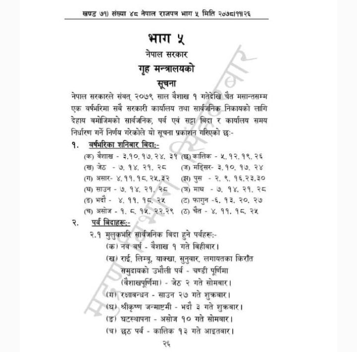 गृहसचिव टेकनारायण पाण्डेले हस्ताक्षर गरेको सूचनामा विश्व मजदुर दिवस, गणतन्त्र दिवस, संविधान दिवस, राष्ट्रिय प्रजातन्त्र दिवस, अन्तर्राष्ट्रिय महिला दिवसमा पनि बिदा दिइएको छ।