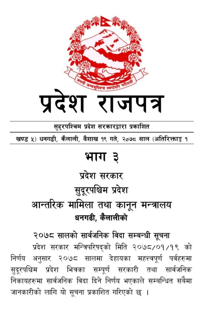 कञ्चनपुर/सुदूरपश्चिमको कैलाली र कञ्चनपुर जिल्लामा २०७८ चैत ११ गते शुक्रबार सार्वजनिक विदा दिइएको छ ।
