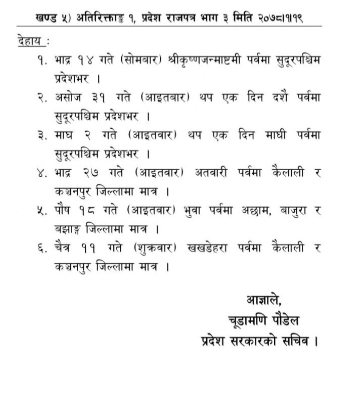 उक्त दिन राना थारु समुदायको खखडेहरा पर्व परेकाले सुदूरपश्चिम प्रदेश सरकारले विदा दिने निर्णय गरेको हो । प्रदेश सरकारको आन्तरिक मामिला तथा कानून मन्त्रालयले कैलाली र कञ्चनपुरमा रहेका सम्पूर्ण सरकारी कार्यालयहरूमा सार्वजनिक विदाबारे जानकारी गराएको छ ।