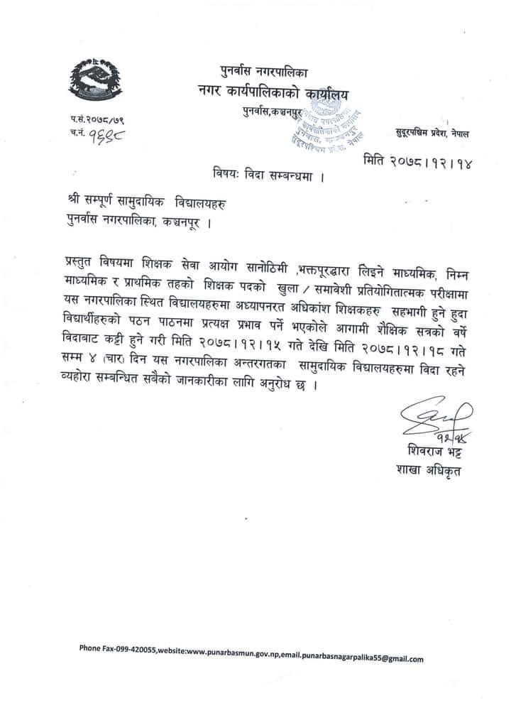पुनर्वासका सामुदायिक विद्यालयहरु भोलि चैत्र १५ देखि आगामी चैत्र १८ सम्म विदा हुने भएको छ । पुनर्वास नगरपालिकाले आज एक सूचना प्रकाशन गर्दै शिक्षक सेवा आयोगले प्राथमिक, निम्न माध्यमिक र माध्यमिक तहको खुला/सामावेशी प्रतियोगितात्मक परीक्षामा पुनर्वास नगरपालिका क्षेत्रका विद्यालयका अधिकांस शिक्षकहरु सहभागी हुने भएकाले विद्यालय विदा गर्नुपरेको जनाएको छ । पुनर्वास नगरपालिकाका शाखा अधिकृत शिवराज भट्टद्वारा हस्ताक्षरीत सो सूचनामा हाल दिईएको दिन ४ (चार)को विदा आगामी शैक्षिक सत्रको वर्षे विदाबाट कट्टी हुने पनि जनाईएको छ ।