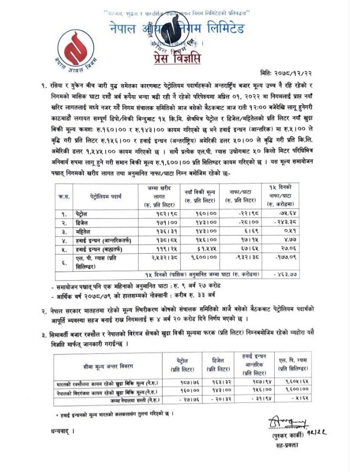 काठमाडौ/ नेपाल आयल निगमले इन्धनको मूल्य फेरि बढाएको छ । निगमले पेट्रोलको मूल्य प्रतिलिटर ५ रुपैयाँ बढाएको छ । त्यस्तै डिजेल र मट्टितेल पनि प्रतिलिटर ५ रुपैयाँले बढेको छ । अब पेट्रोलको मूल्य प्रतिलिटर १६० रुपैयाँ तथा डिजेल र मट्टितेलको मूल्य १४३ रुपैयाँ पर्ने भएको छ । त्यस्तै खाना पकाउने ग्यासको मूल्य प्रतिसिलिण्डर २५ रुपैयाँ बढाएर १६ सय कायम गरिएको छ । आयल निगमले नोक्सानी बढेको भन्दै इन्धनको मूल्य बढाएको हो । निगमका अनुसार बढेको मूल्य मंगलबार राति १२ बजेदेखि लागू भएको छ । यसअघि निगमले चैत २ गते पेट्रोलियम पदार्थको भाउ बढाएको थियो ।