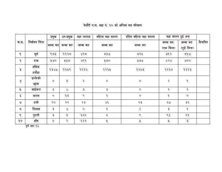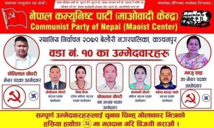 कञ्चनपुर/ बेलौरी नगरपालिकामा नेकपा माओवादी केन्द्रले २ वटा वडामा विजय सुरुवात गरेको छ । नेकपा माओवादी केन्द्रले बेलौरी नगरपालिका वडा नम्बर १ मा विजय सुरुवात सनिबार नै गरिसकेको छ भने बेलौरी नगरपालिका वडा नम्बर १० मा पनि विजय सुरुवात गरेको छ । निर्वाचन अधिकृतको कार्यालय बेलौरीका अनुसार बेलौरी नगरपालिका वडा नम्बर १० मा माओवादी केन्द्रको प्यानल नै निर्वाचित भएको छ । माओवादी केन्द्रका सोमलाल चौधरी निर्वाचित हुनुभएको छ । चौधरीले १ हजार १ सय १६ मत प्राप्त गर्दै प्यानल सहित विजयी हुनुभएको हो । एमालेका लोकेन्द्र प्रसाद जोशीले ४२८ प्राप्त गर्नुभयो भने कांग्रेसका तारादेबी खड्काले ४९९ मत प्राप्त गर्नुभएको छ । बेलौरी नगरपालिका वडा नम्बर १० मा ३ हजार ५ सय ८ मत खसेका थियो ।