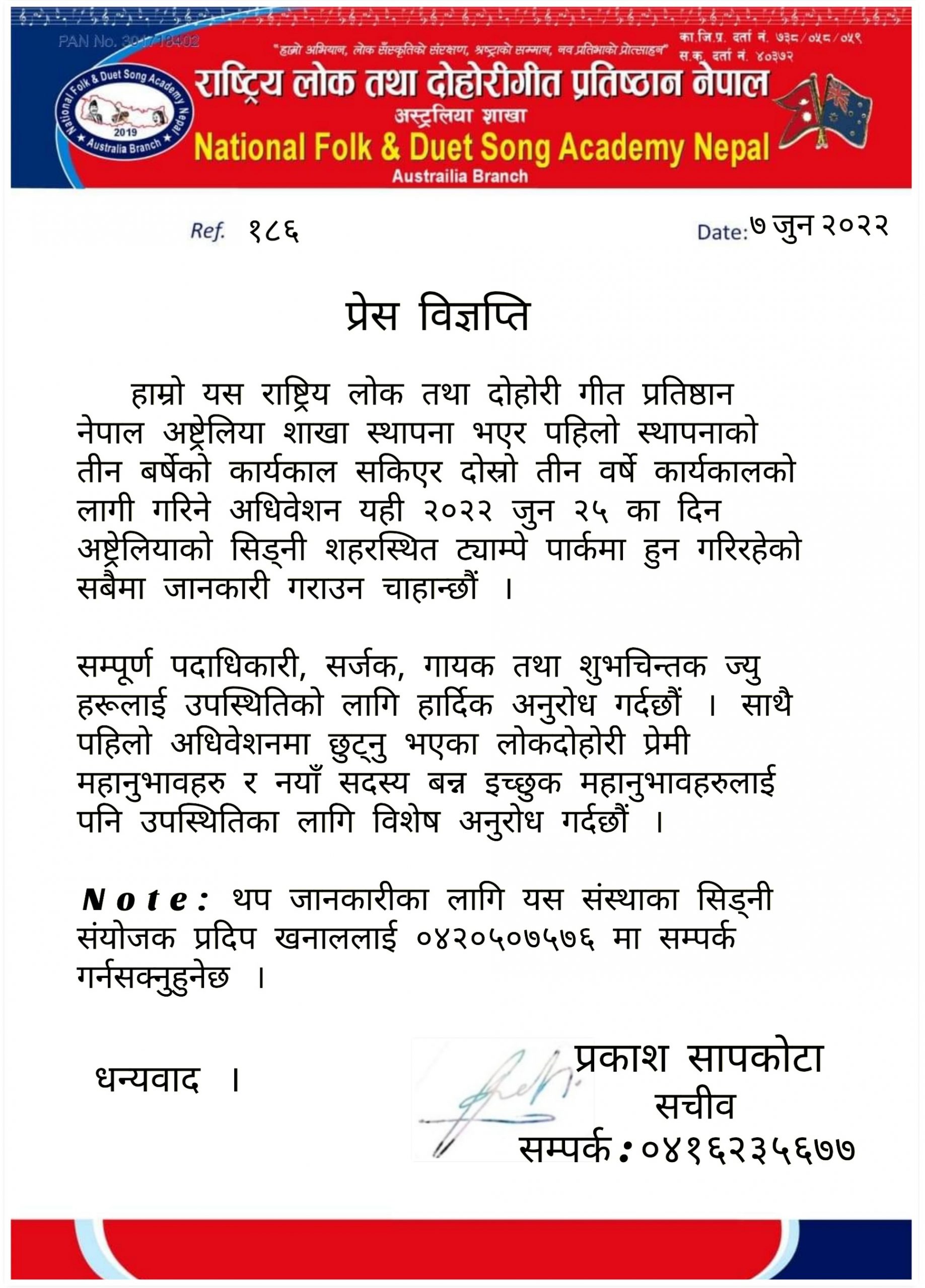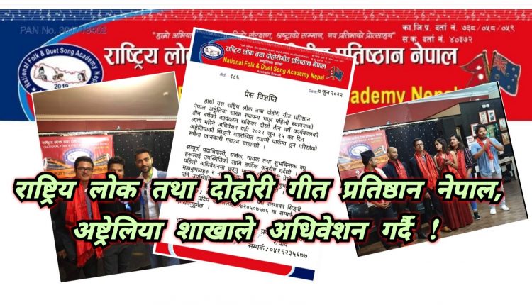 नेपाली गीतसंगीत, कलासंस्कृत, भेषभुसा तथा रितिरिवाजको संरक्षण र प्रवर्द्धन गर्ने उद्देश्य लिएको संस्थाको अष्ट्रेलिया शाखाको पहिलो ३ बर्षे कार्यकाल सकिएको छ । दोस्रो कार्यकालका लागि अधिवेशन हुन भएको हो । पहिलो कार्यकालमा विशाल इन्टरटेनमेन्टका सञ्चालक गोविन्द भट्टराई अध्यक्ष छन ।