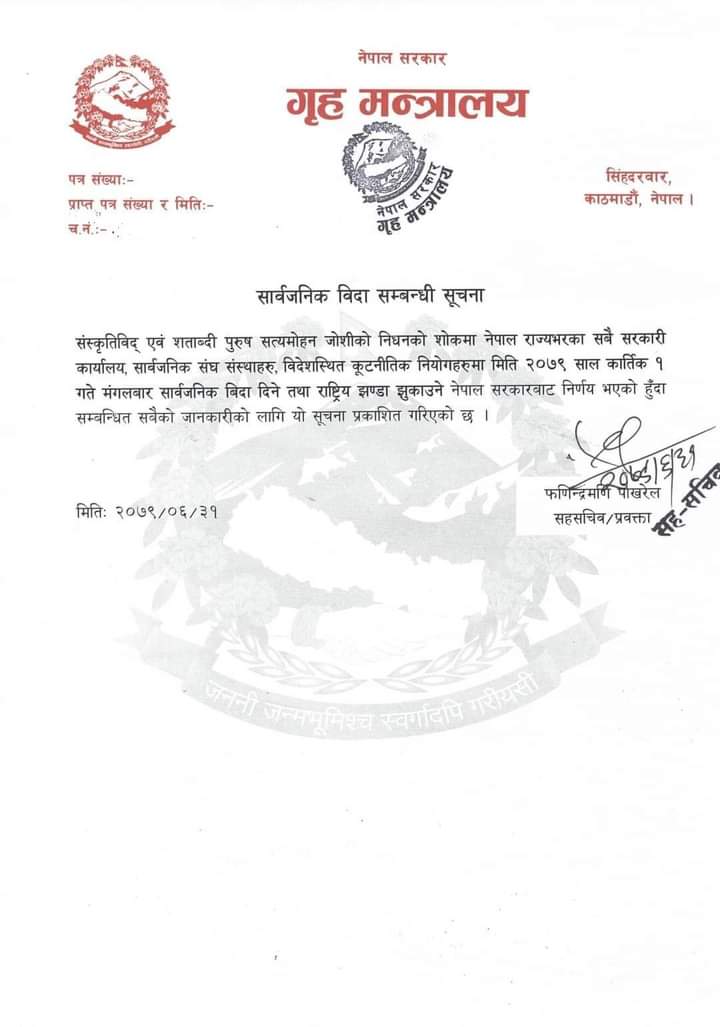 काठमाडौ / सरकारले शताब्दी पुरुष सत्यमोहन जोशीको निधनमा भोलि (मंगलबार) देशभर सार्वजनिक बिदा