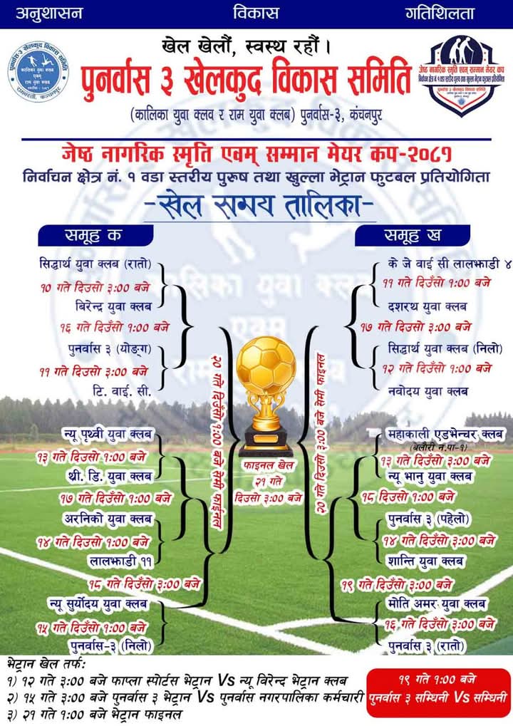 पुनर्वास ३ खेलकुद विकास समिति (कालिका युवा क्लव र राम युवा क्लव पुनर्वास ३) कंचनपुरको आयोजनामा “जेष्ठ नागरिक स्मृति तथा सम्मान मेयर कप वडा स्तरिय फुटबल प्रतियोगिता र जेष्ठ नागरिक स्मृति तथा सम्मान कप खुल्ला पुरुष भेट्रान फुटबल प्रतियोगिताको दोस्रो संस्करण २०८१